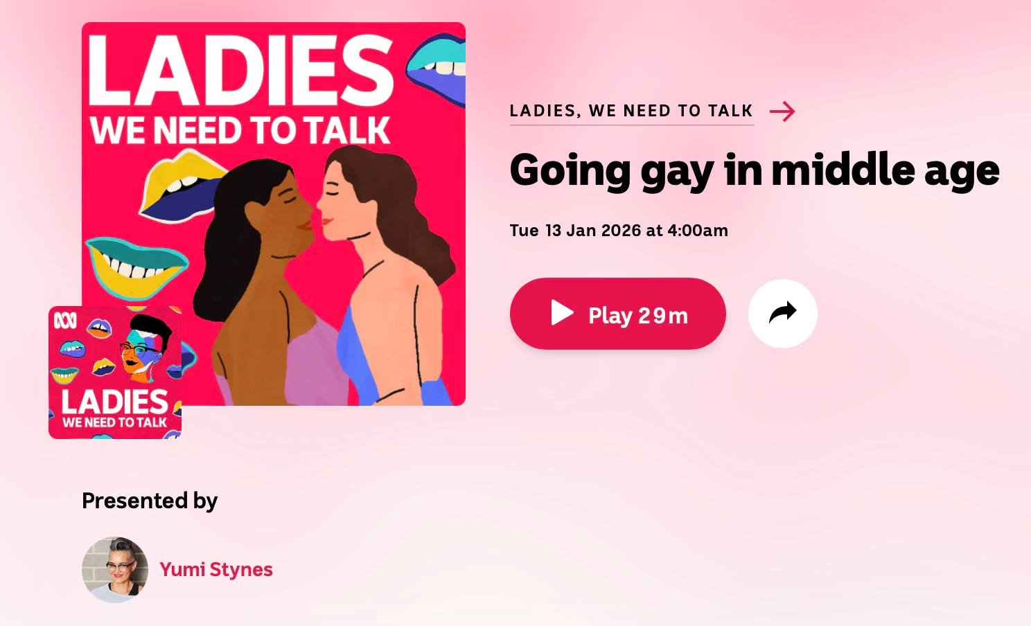 This is a podcast I almost always listen to when a new ep comes out. It’s a podcast I wish I was making. Out of the ABC in Oz, it covers fascinating aspects of women’s lives that I want to talk about, too! Host Yumi Stynes has a really lovely way of getting her guests to open up about sometimes really intimate topics, often focusing on relationships and sexuality (but not always). The latest ep is titled ‘Going gay in middle age’ and explores why so many women are coming out in their second act. I found it fascinating. There was also a great one recently on ‘what we wish men knew about sex’ and a faaaascinating one about a woman who decided to book a sex worker for herself for her 70th birthday. Look for it on your podcast app and recommend subscribing.